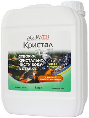 Позволяет поддерживать кристальную чистоту и прозрачность воды в пруду. AQUAYER Кристалл содержит коагулянт, который обеспечивает слипание мелких взвешенных частиц грязи, глины и водорослей с образованием более крупных частиц, которые оседают на дно и могут быть легко удалены из пруда.