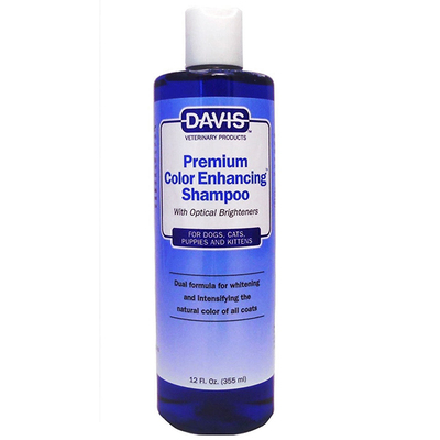 Davis Premium Color Enhancing - двойная формула для очищения и интенсивности натурального цвета любой шерсти собак и котов, при этом активизируется естественный блеск окрасов всех пород. Шампунь отлично работает как восстанавливающее и оптически отбеливающее средство для грязной пожелтевшей шерсти без использования отбеливающих компонентов.