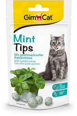 GimCat MintTips – это вкусные снеки с ароматной кошачьей мятой, произведенные из отборных ингредиентов без добавления сахара. MintTips – чрезвычайно вкусный деликатес, которым ваша кошка может не только полакомиться, но и поиграть. Прекрасное сочетание вкуса и удовольствия от игры.