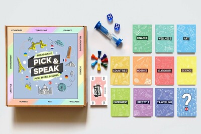 PICK & SPEAK — это инновационная коммуникативная настольная игра для изучающих английский, немецкий, французский, украинский или нидерландский язык. Игра развивает разговорные навыки, навыки аудирования, логического мышления, а также способствует социализации: игроки делятся историями, дискутируют, расширяют кругозор друг друга и становятся уверенными собеседниками. За вопросы и ответы игроки получают "пиккоины" — игровую валюту.