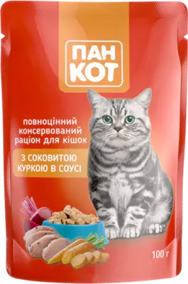 Влажный корм торговой марки Пан Кот – это специально разработанный рецепт, содержащий сбалансированную комбинацию витаминов и микроэлементов, который поддерживает на должном уровне иммунную систему кошки, и учитывает все ее физиологические потребности. В своей основе содержит мясные ингредиенты из курицы, рыбы и говядины.