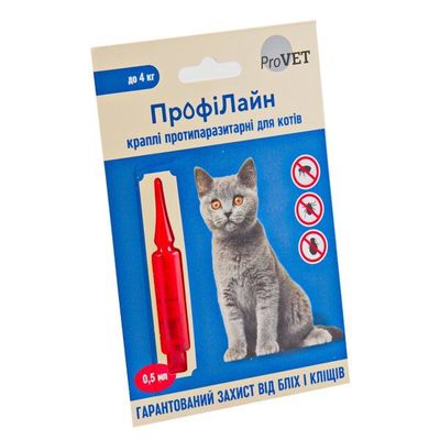 «ПрофиЛайн» имеет удобную форму выпуска спот-он (капли на холку), а также практичную дозировку препарата для котов весом до 4 кг. «ПрофиЛайн» назначают с профилактической и лечебной целью при заражении внешними паразитами: блохами (Ctenocephalides spp.), вшами (Linognathus spp.), власоедами (Trichodectes canis, Felicola subrostratus) и паразитоформный клещами (Rhipicephalus spp., Dermacentor spp., Ixodes spp.).