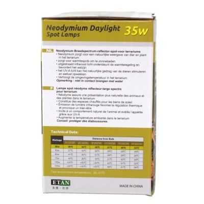 Неодимовая лампа, благодаря специальному напылению, наиболее близка к природному солнечному свету. Она в разы эффективней, чем обычные лампы накаливания благодаря встроенному отражателю. Так, тепло и УФ лучи от лампы расходятся по всему террариуму.