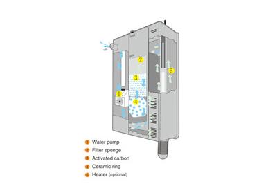 Удобный и надежный фильтр для аквариума обеспечивает качественную трехступенчатую фильтрацию воды. Сначала вода проходит через губку, где происходит механическая фильтрация, далее попадает в отсек с активированным углем (рекоменуется заменять минимум раз в месяц) и потом проходит через керамические кольца которые в аквариуме заселяются полезными бактериями. Керамические кольца и активированный уголь могут не идти в комплекте, в зависимости от партии.