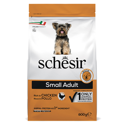 Schesir Dog Small Adult Chicken – полноценный сбалансированный рацион для собак малых пород, состоящий из натуральных ингредиентов с добавлением комплекса витаминов и минералов, необходимых для здоровья и долголетия вашего питомца. С высоким содержанием курицы без добавления других источников животного белка – монопротеиновая формула. Данный корм рекомендуется для собак возрастом от 1 года.