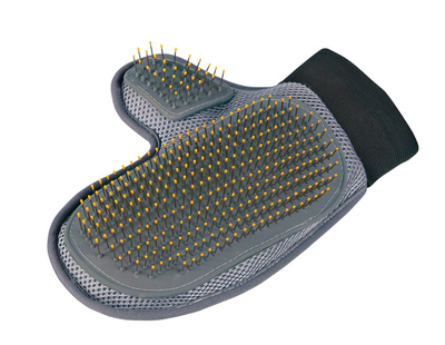 Удобная перчатка для вычесывания изготовлена из приятного к телу и крепкого материала. Зубчики выполнены из металла, а для того, что бы не травмировать вашего любимца каждый зубчик оснащен пластиковым шариком на конце. С этой перчаткой можно гладить животное с пользой - одновременно удаляя отмершую шерсть. Во время расчесывания перчаткой также стимулируется кровообращение у животного.