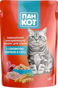 Пан Кот дбає про вашого улюбленця і пропонує лише якісні та смачні рішення для його харчування. Спробуйте Вологий корм для котів "Індичка в соусі" від Пан Кот і порадуйте свого кота смачною та корисною стравою!