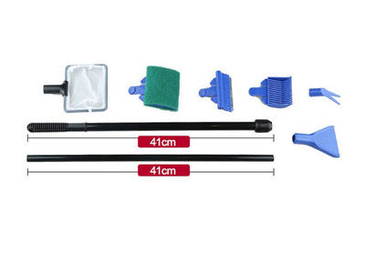 Рано чи пізно будь-який акваріум доводиться чистити. У такому випадку на допомогу приходить набір для чищення акваріума від SunSun. Набір складається з п’яти пластикових предметів, які кріпляться до ручки за допомогою зручної защіпки. Довжина ручки 54-80 см